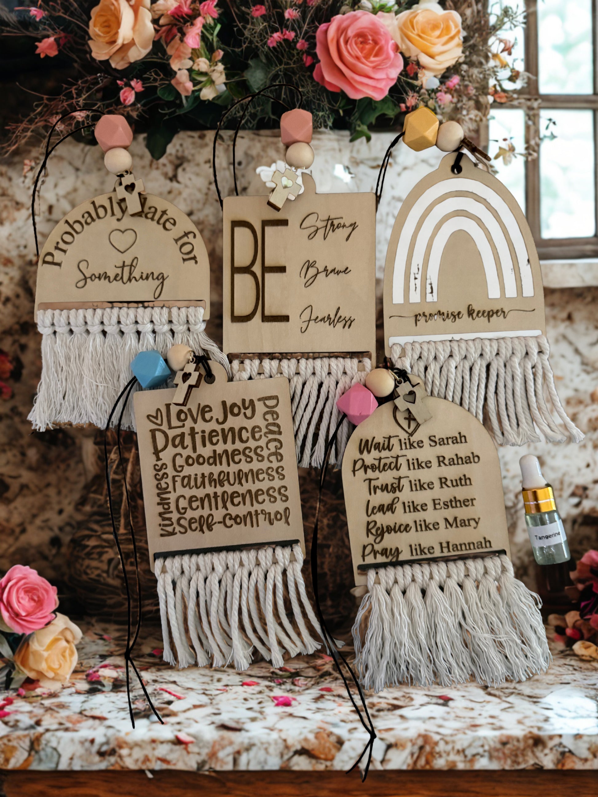 Bring faith, beauty, and a gentle fragrance wherever life takes you. These handcrafted wooden beaded car charms are thoughtfully designed with faith-inspired engravings, soft macramé fringe, and natural wood beads—perfect for hanging from your rearview mirror or anywhere you’d like a meaningful reminder.